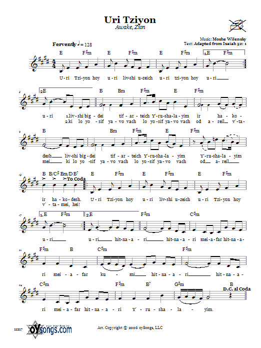 Download or print Moshe Wilensky Uri Tziyon (Awake, Zion) sheet music, chords and digital score arranged for Lead Sheet / Fake Book. This Traditional score includes 2 page(s).