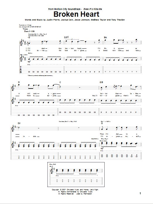 Download or print Motion City Soundtrack Broken Heart sheet music, chords and digital score arranged for Guitar Tab. This Pop score includes 6 page(s).
