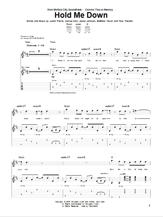 Download or print Motion City Soundtrack Hold Me Down sheet music, chords and digital score arranged for Guitar Tab. This Pop score includes 8 page(s).