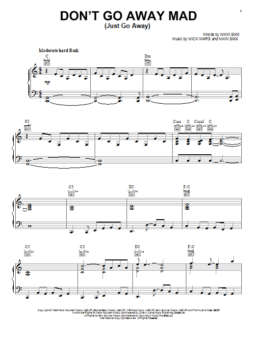 Download or print Motley Crue Don't Go Away Mad (Just Go Away) sheet music, chords and digital score arranged for Piano, Vocal & Guitar Chords (Right-Hand Melody). This Pop score includes 8 page(s).