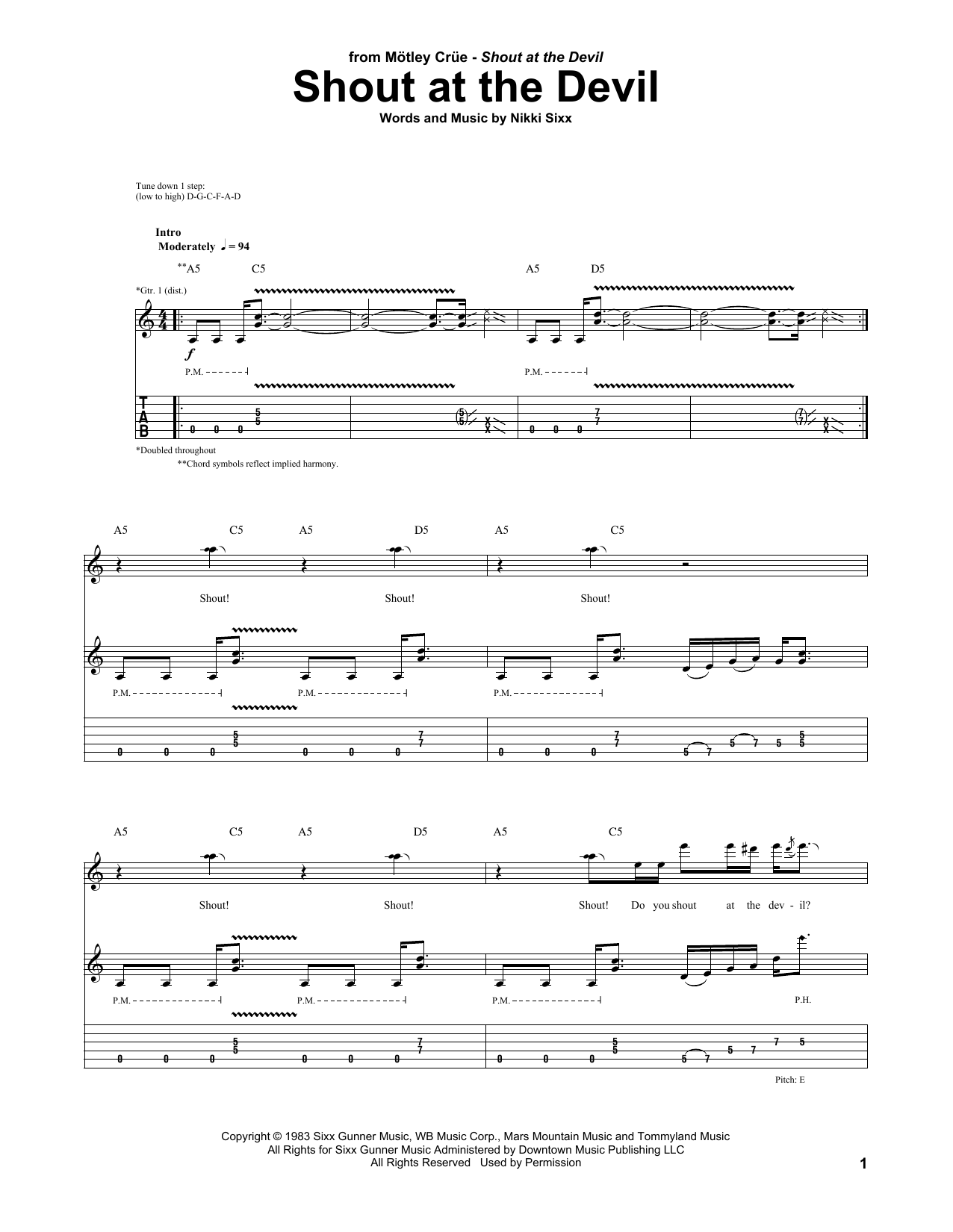 Download or print Motley Crue Shout At The Devil sheet music, chords and digital score arranged for Guitar Tab. This Pop score includes 7 page(s).