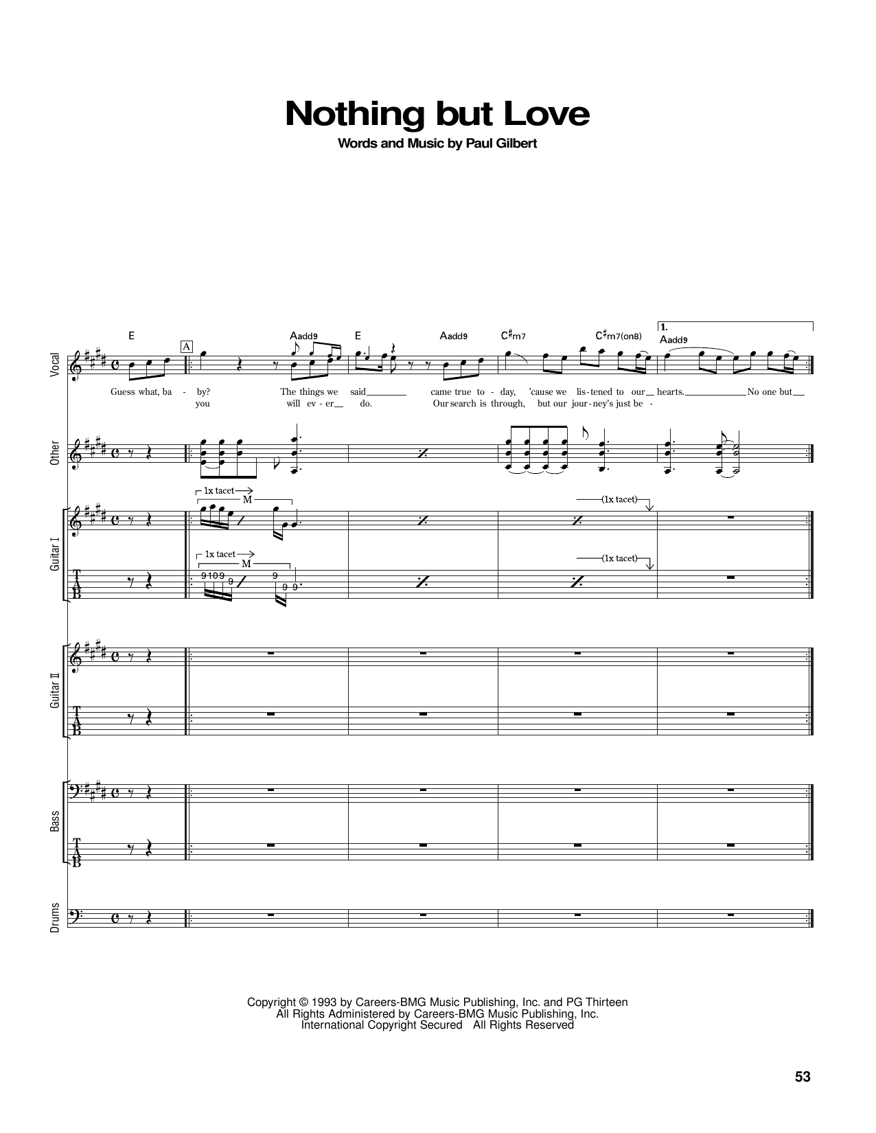 Download or print Mr. Big Nothing But Love sheet music, chords and digital score arranged for Guitar Tab. This Pop score includes 8 page(s).