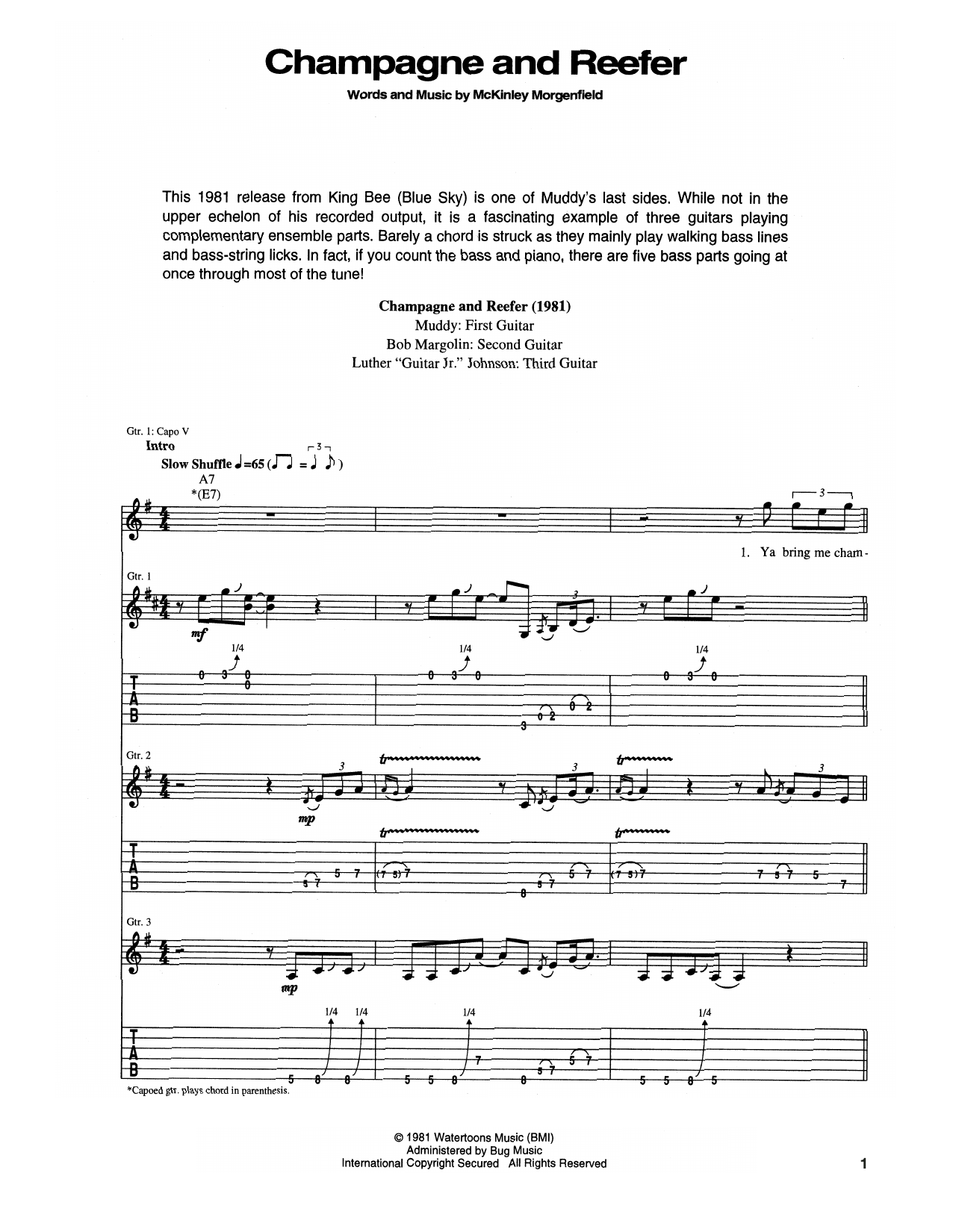 Download or print Muddy Waters Champagne And Reefer sheet music, chords and digital score arranged for Guitar Tab. This Blues score includes 5 page(s).