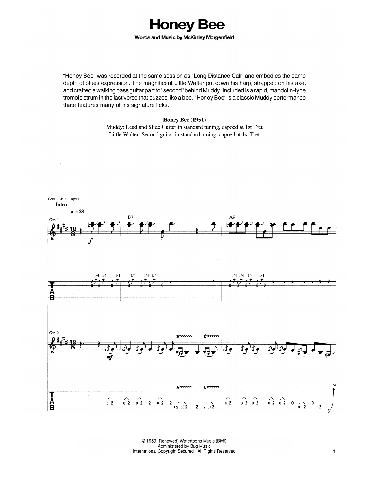 Download or print Muddy Waters Honey Bee sheet music, chords and digital score arranged for Guitar Tab. This Blues score includes 8 page(s).