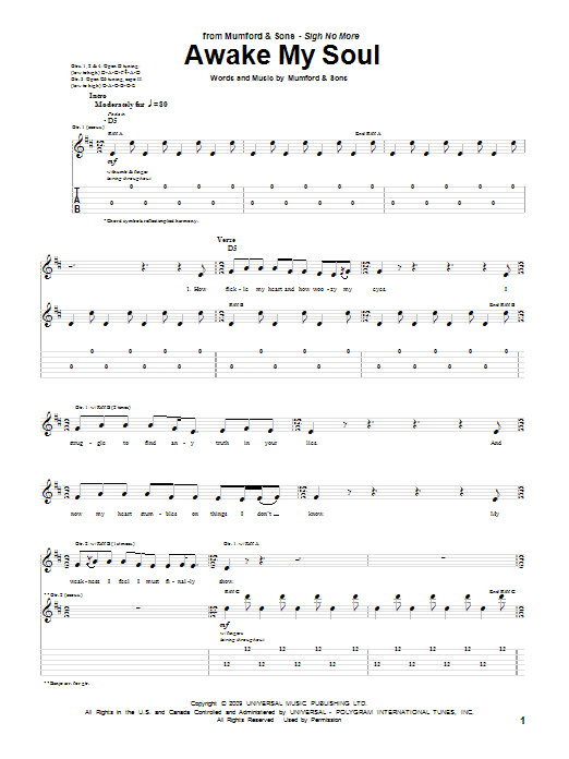 Download or print Mumford & Sons Awake My Soul sheet music, chords and digital score arranged for Guitar Tab. This Folk score includes 11 page(s).