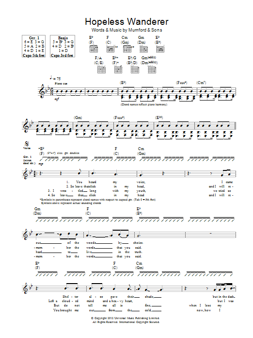 Download or print Mumford & Sons Hopeless Wanderer sheet music, chords and digital score arranged for Guitar Tab. This Folk score includes 10 page(s).