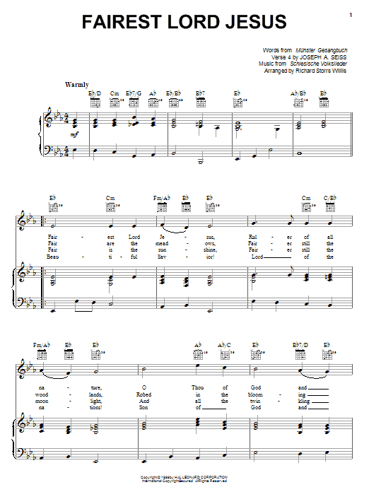Download or print Munster Gesangbuch Fairest Lord Jesus sheet music, chords and digital score arranged for Piano, Vocal & Guitar Chords (Right-Hand Melody). This Christian score includes 2 page(s).