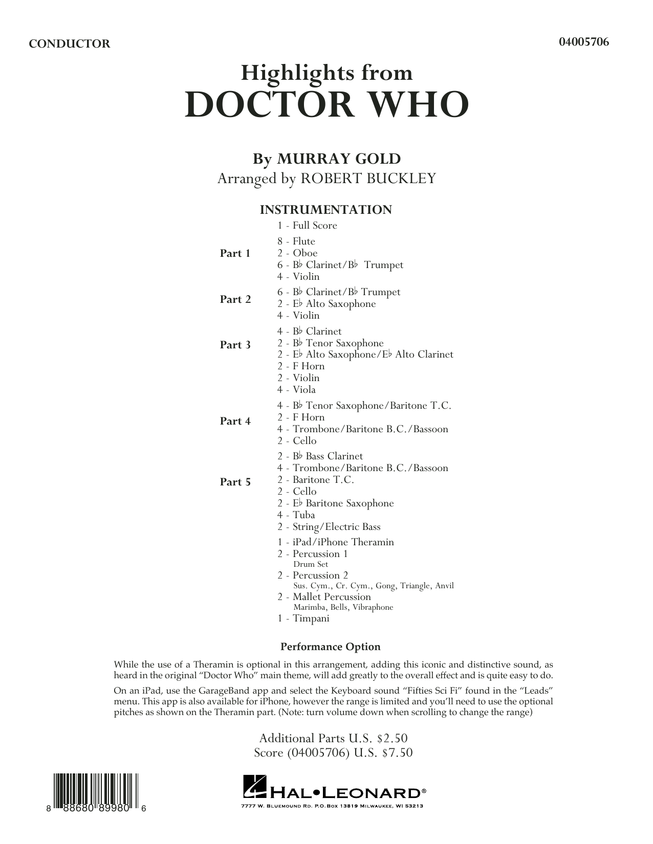 Quick facts Highlights from Doctor Who (arr. Robert Buckley) - Conductor Score (Full Score) about digital sheet music