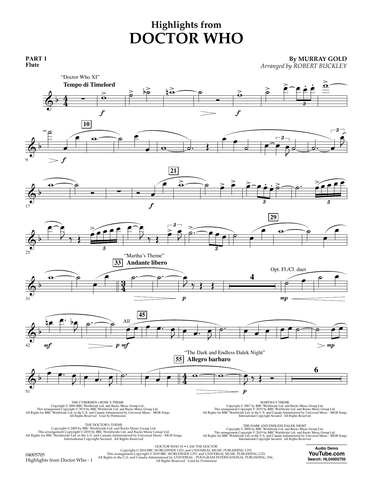 Download or print Murray Gold Highlights from Doctor Who (arr. Robert Buckley) - Pt.1 - Flute sheet music, chords and digital score arranged for Concert Band: Flex-Band. This Concert score includes 3 page(s).