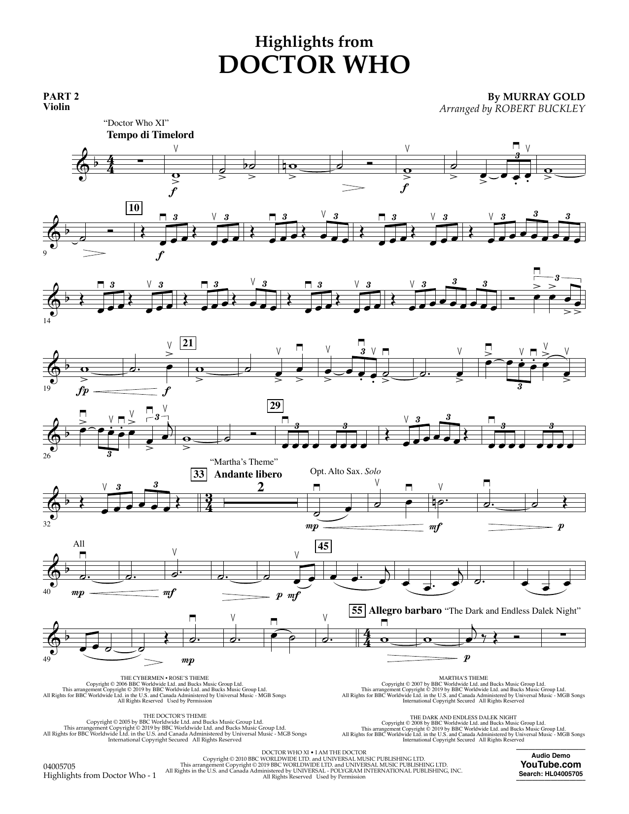 Download or print Murray Gold Highlights from Doctor Who (arr. Robert Buckley) - Pt.2 - Violin sheet music, chords and digital score arranged for Concert Band: Flex-Band. This Concert score includes 3 page(s).