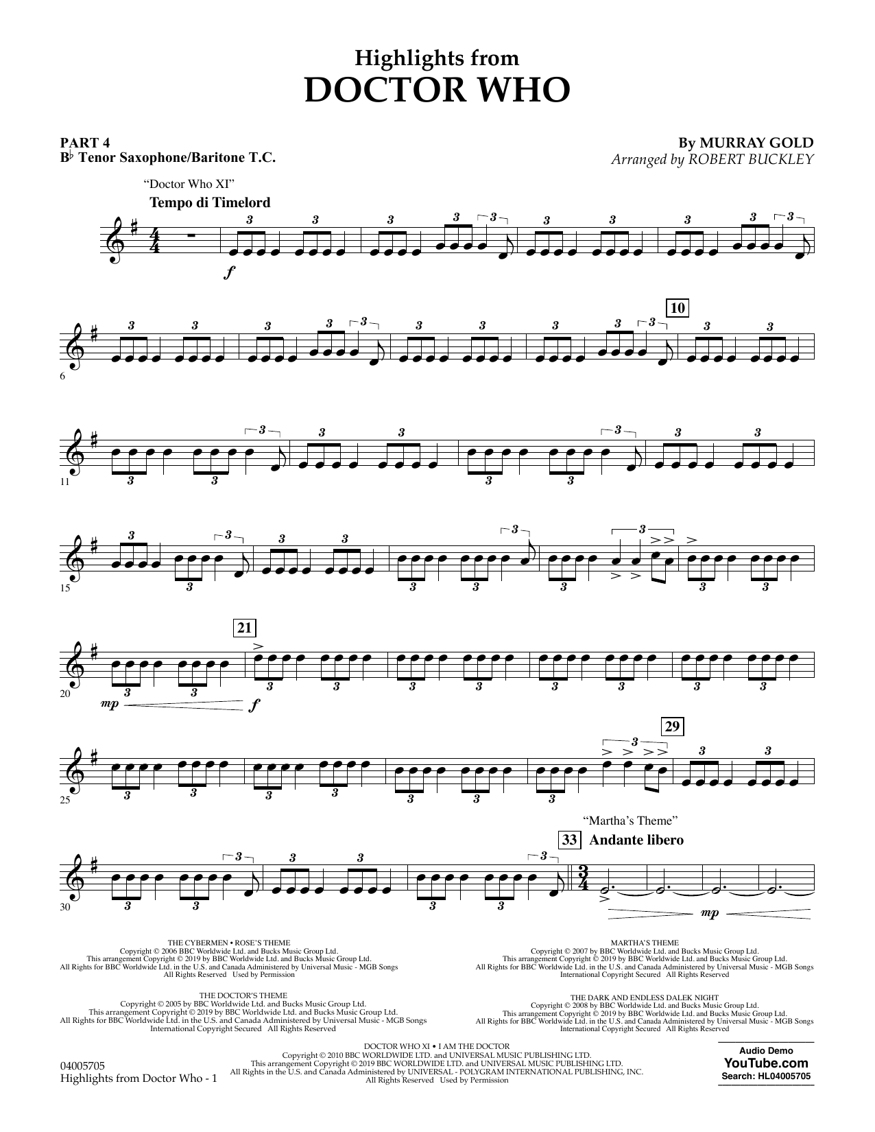 Quick facts Highlights from Doctor Who (arr. Robert Buckley) - Pt.4 - Bb Tenor Sax/Bar. T.C. about digital sheet music