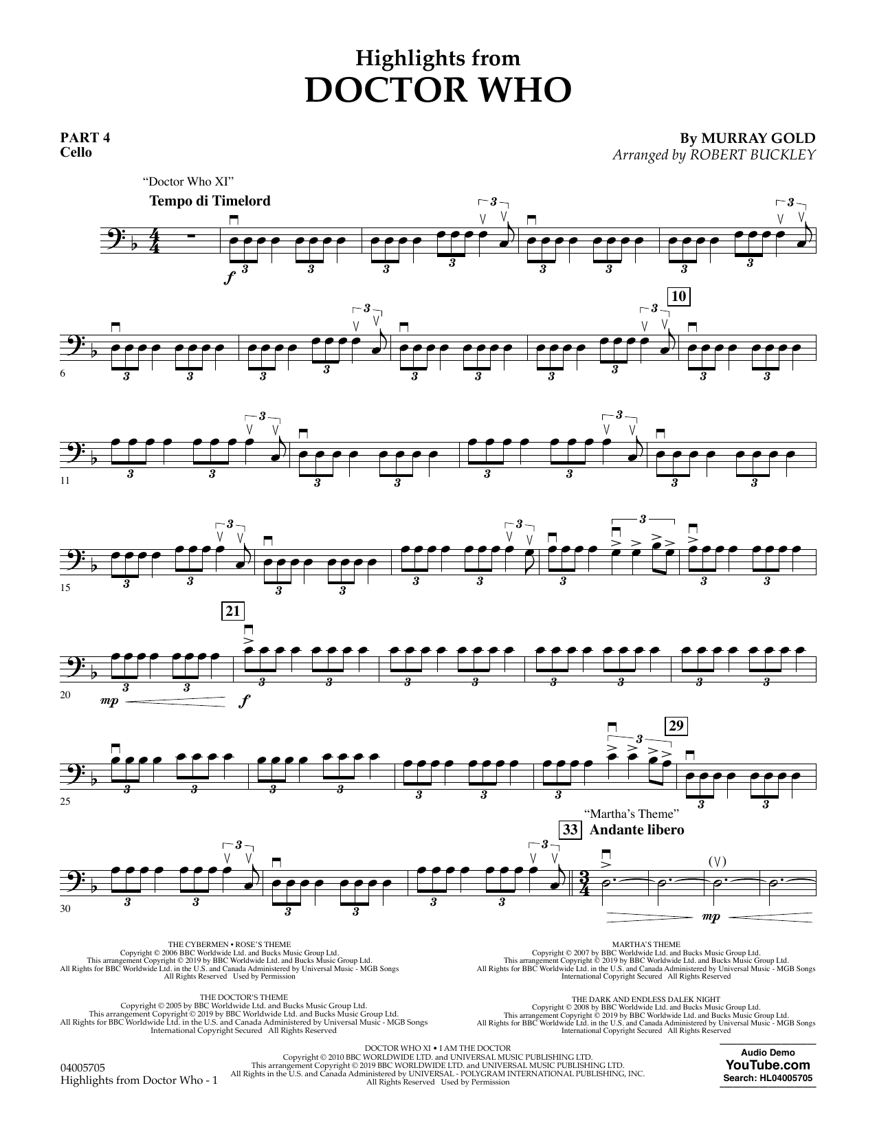 Download or print Murray Gold Highlights from Doctor Who (arr. Robert Buckley) - Pt.4 - Cello sheet music, chords and digital score arranged for Concert Band: Flex-Band. This Concert score includes 3 page(s).
