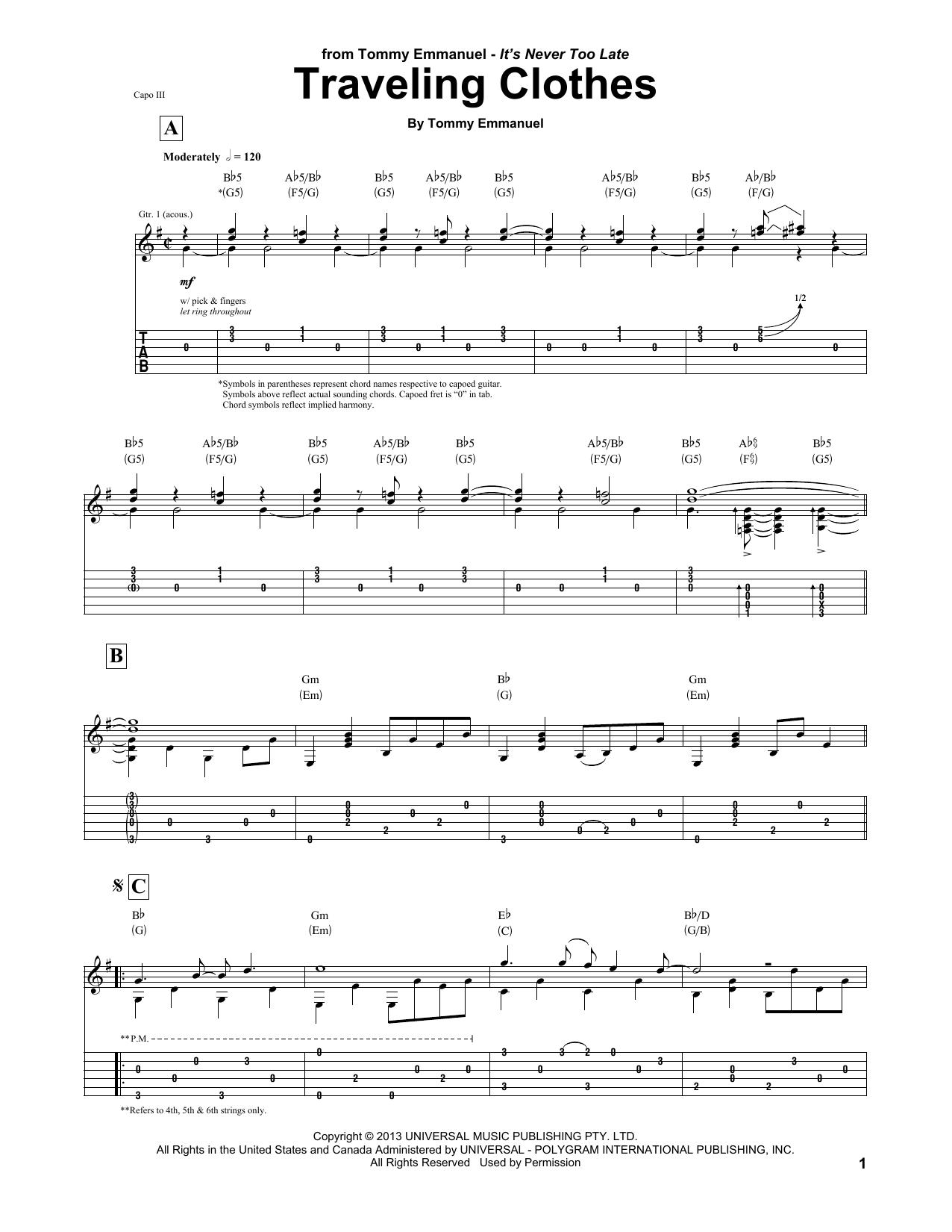 Download or print Tommy Emmanuel Traveling Clothes sheet music, chords and digital score arranged for Guitar Tab. This Jazz score includes 4 page(s).