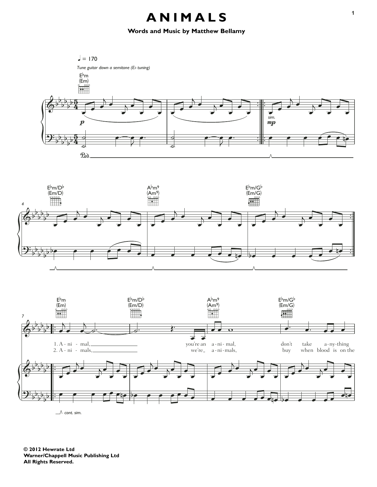 Download or print Muse Animals sheet music, chords and digital score arranged for Piano, Vocal & Guitar Chords (Right-Hand Melody). This Pop score includes 6 page(s).