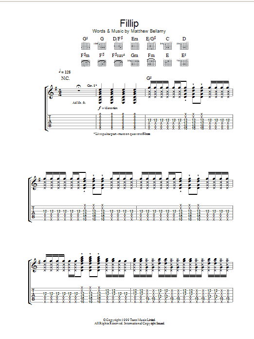 Download or print Muse Fillip sheet music, chords and digital score arranged for Guitar Chords/Lyrics. This Rock score includes 2 page(s).