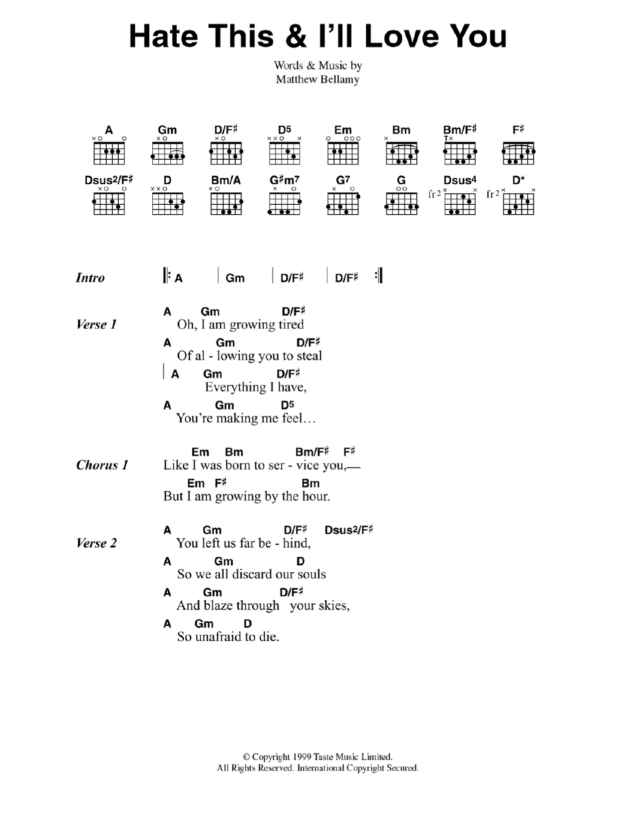 Download or print Muse Hate This and I'll Love You sheet music, chords and digital score arranged for Guitar Chords/Lyrics. This Rock score includes 2 page(s).