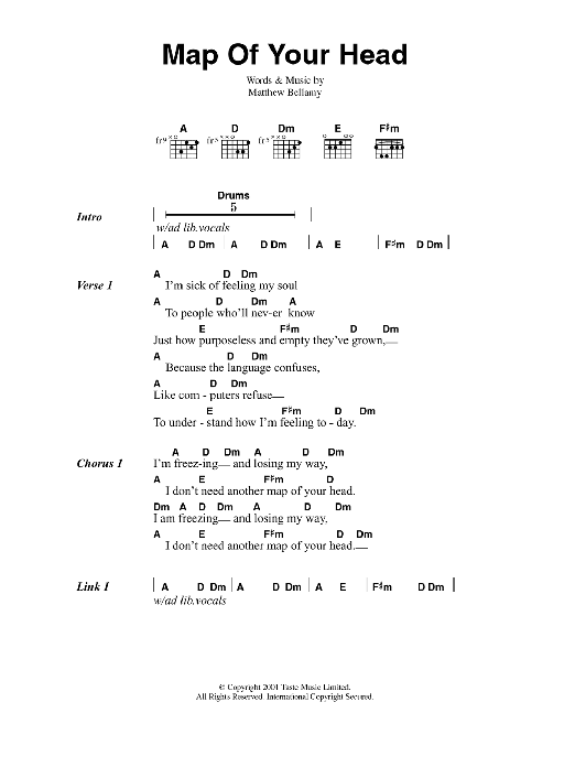 Download or print Muse Map Of Your Head sheet music, chords and digital score arranged for Guitar Chords/Lyrics. This Rock score includes 2 page(s).