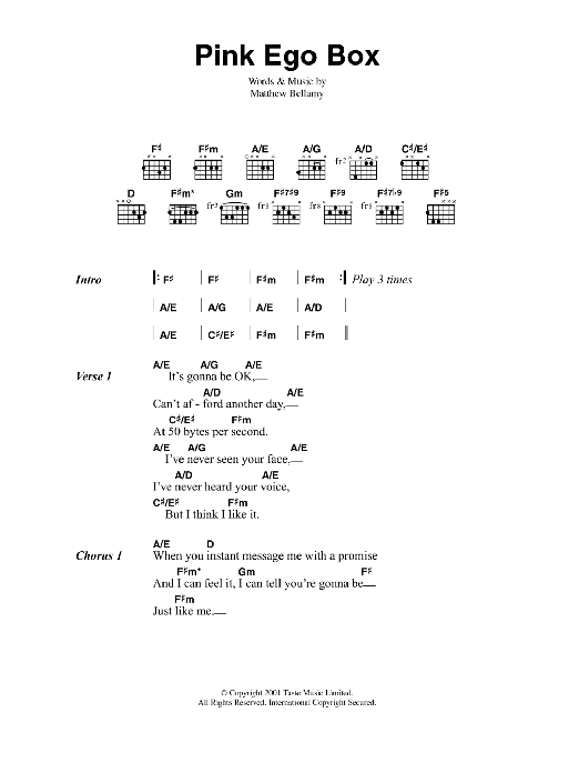 Download or print Muse Pink Ego Box sheet music, chords and digital score arranged for Guitar Chords/Lyrics. This Rock score includes 2 page(s).