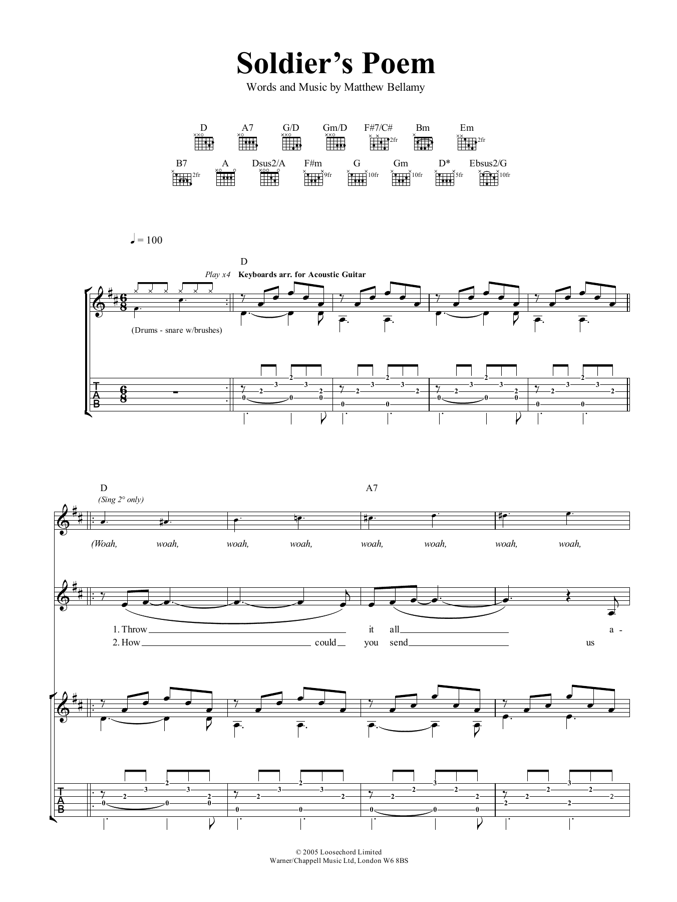 Download or print Muse Soldier's Poem sheet music, chords and digital score arranged for Guitar Tab. This Rock score includes 4 page(s).