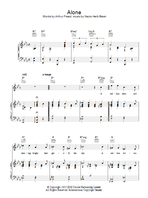 Download or print Nacio Herb Brown Alone sheet music, chords and digital score arranged for Piano, Vocal & Guitar Chords. This Standards score includes 4 page(s).