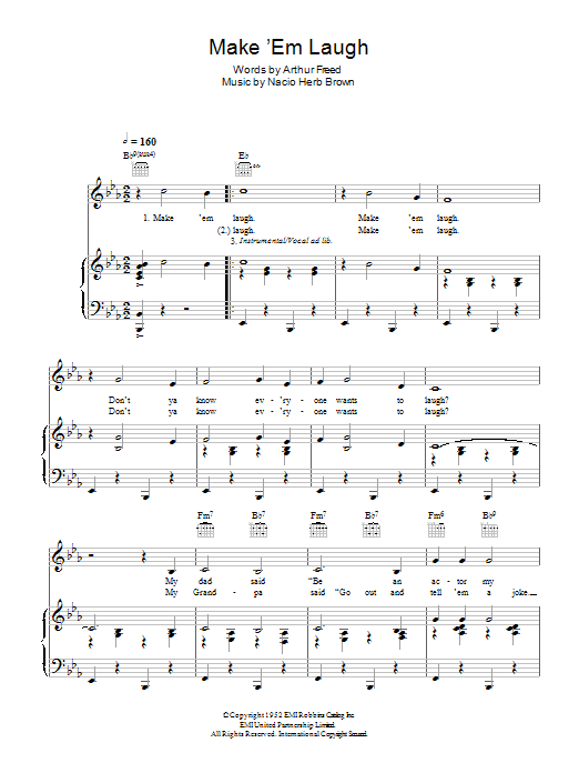 Download or print Nacio Herb Brown Make 'Em Laugh sheet music, chords and digital score arranged for Piano, Vocal & Guitar Chords. This Musical/Show score includes 4 page(s).
