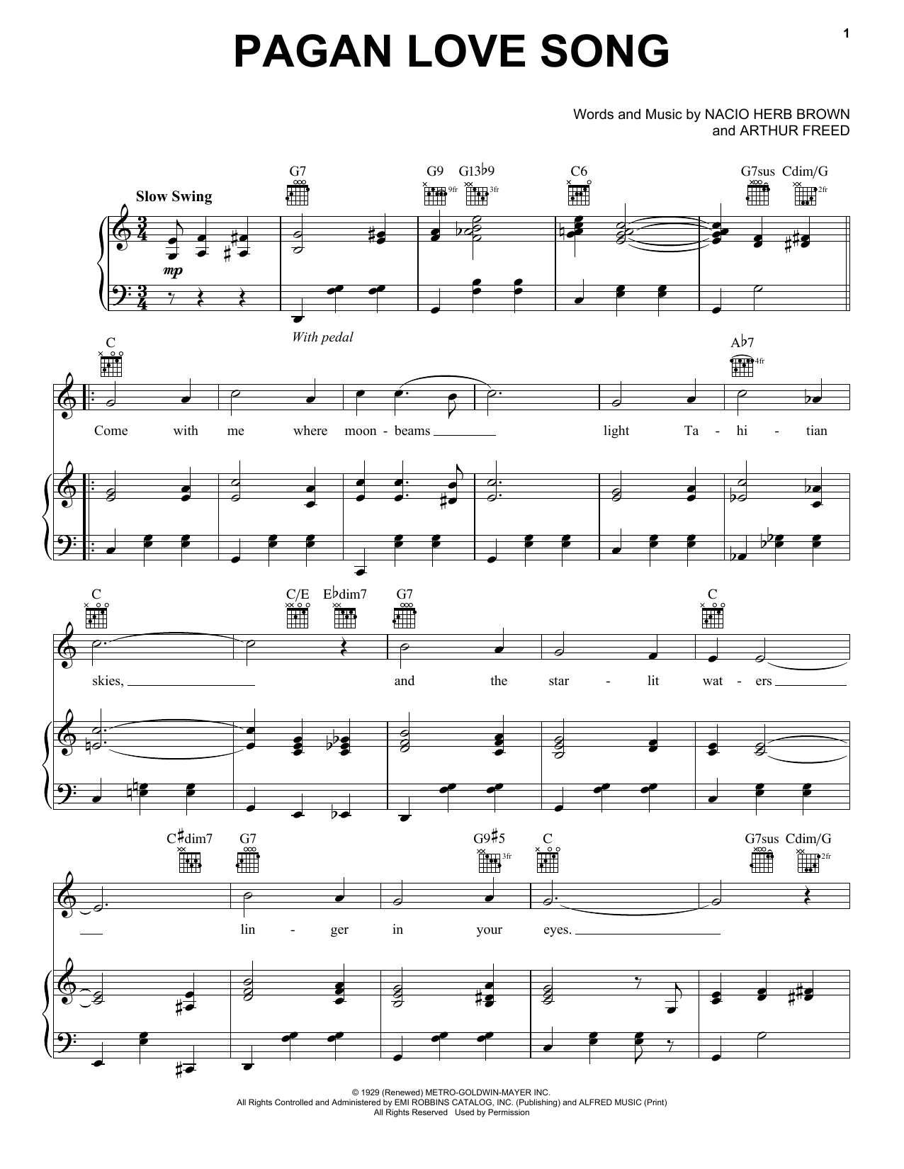 Download or print Nacio Herb Brown Pagan Love Song sheet music, chords and digital score arranged for Piano, Vocal & Guitar Chords (Right-Hand Melody). This Jazz score includes 2 page(s).