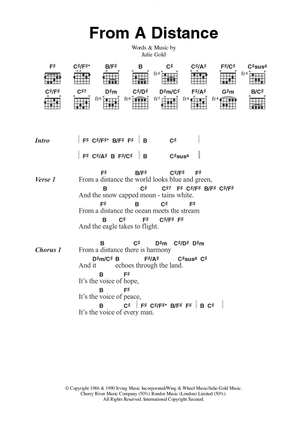 Download or print Nanci Griffith From A Distance sheet music, chords and digital score arranged for Guitar Chords/Lyrics. This Country score includes 3 page(s).