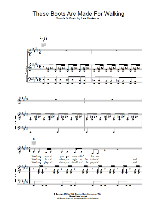 Download or print Nancy Sinatra These Boots Are Made For Walking sheet music, chords and digital score arranged for Piano Chords/Lyrics. This Pop score includes 2 page(s).