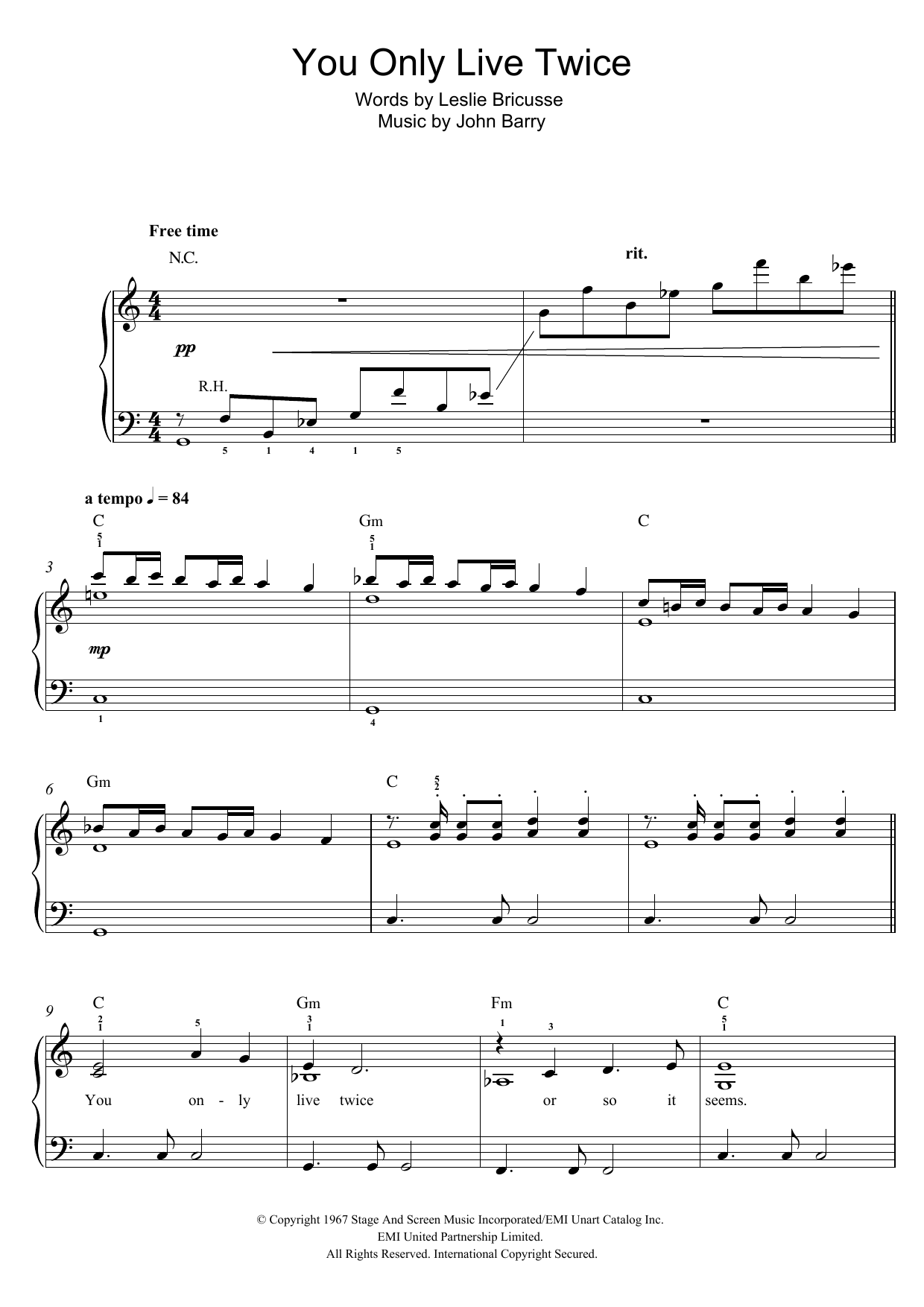 Download or print Nancy Sinatra You Only Live Twice (theme from the James Bond film) sheet music, chords and digital score arranged for Easy Piano. This Film/TV score includes 3 page(s).