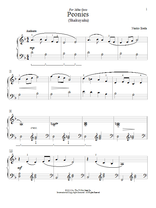 Download or print Naoko Ikeda Peonies (Shakuyaku) sheet music, chords and digital score arranged for Educational Piano. This Pop score includes 3 page(s).