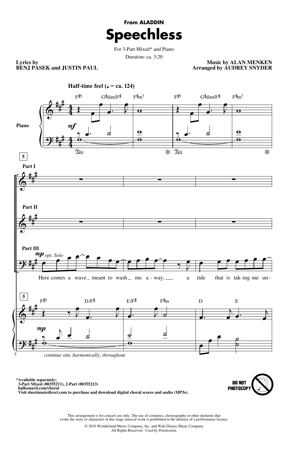 Download or print Naomi Scott Speechless (from Disney's Aladdin) (arr. Audrey Snyder) sheet music, chords and digital score arranged for 3-Part Mixed Choir. This Children score includes 14 page(s).