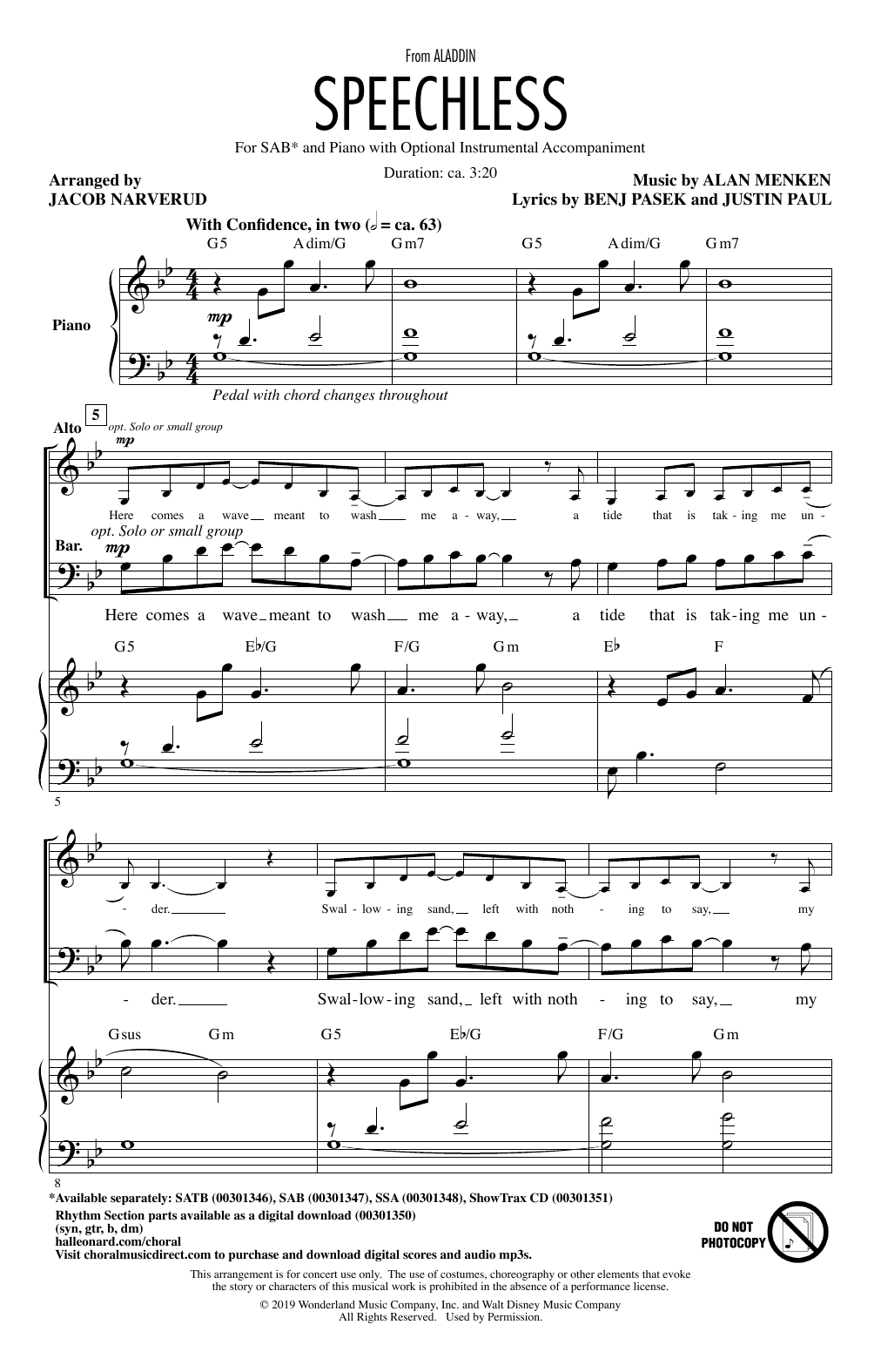 Download or print Naomi Scott Speechless (from Disney's Aladdin) (arr. Jacob Narverud) sheet music, chords and digital score arranged for SAB Choir. This Disney score includes 14 page(s).