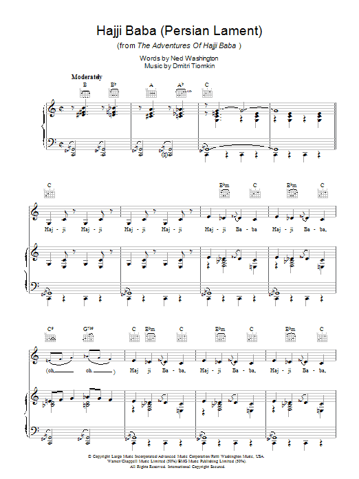 Download or print Nat King Cole Hajji Baba (Persian Lament) sheet music, chords and digital score arranged for Piano, Vocal & Guitar Chords. This Film/TV score includes 5 page(s).