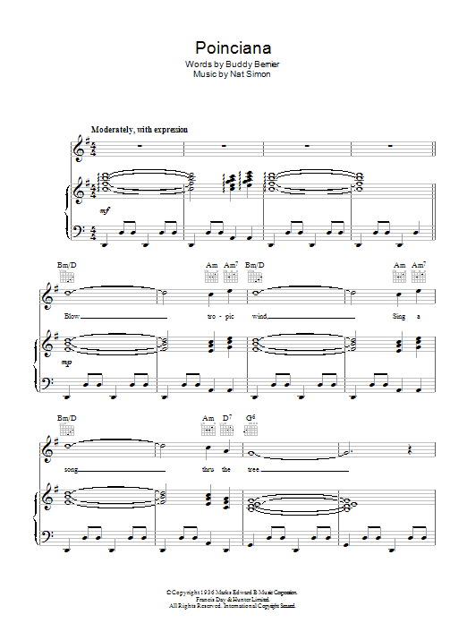 Download or print Nat King Cole Poinciana sheet music, chords and digital score arranged for Piano, Vocal & Guitar Chords (Right-Hand Melody). This Standards score includes 5 page(s).