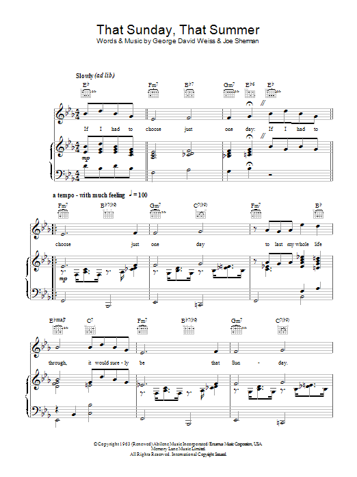Download or print Nat King Cole That Sunday That Summer sheet music, chords and digital score arranged for Piano, Vocal & Guitar Chords. This Standards score includes 4 page(s).