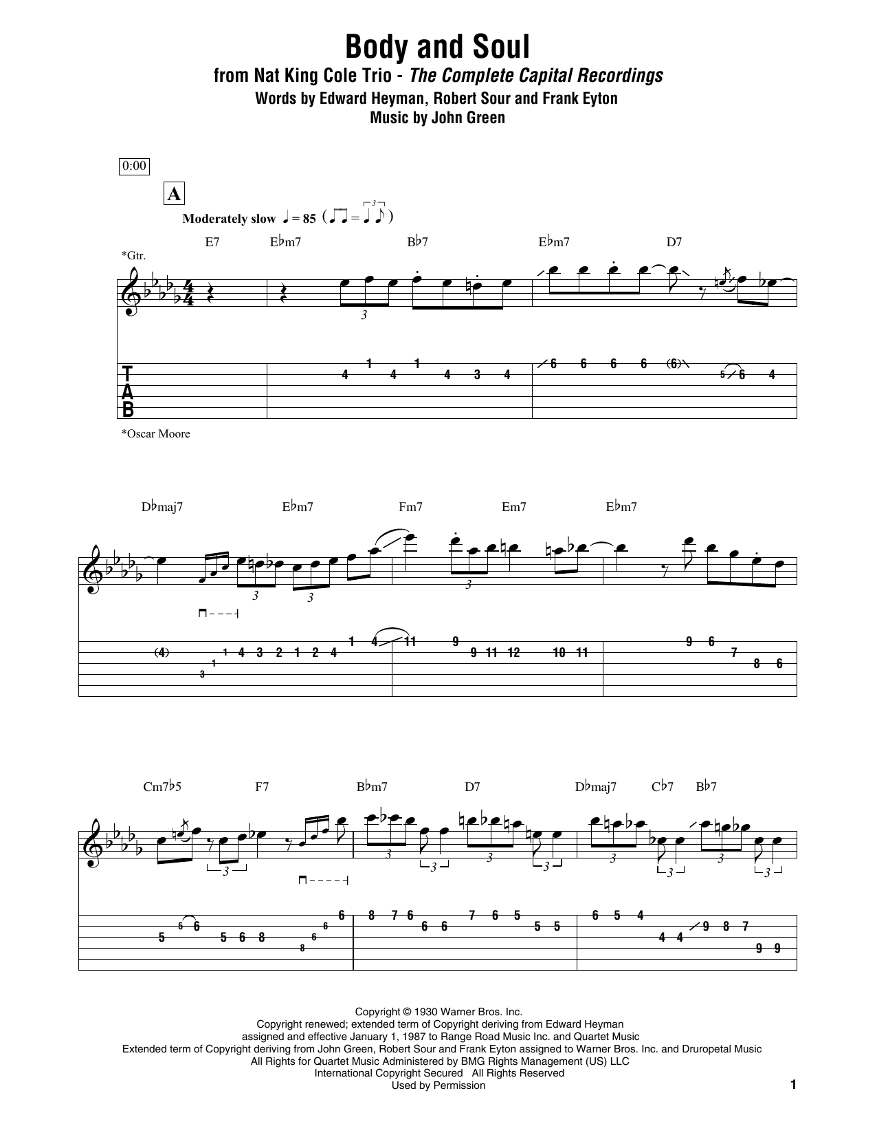 Download or print Nat King Cole Trio Body And Soul sheet music, chords and digital score arranged for Electric Guitar Transcription. This Jazz score includes 4 page(s).