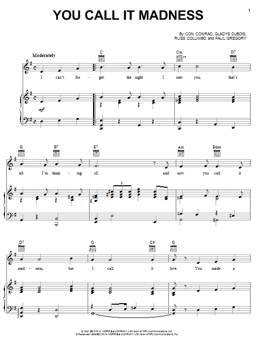 Download or print Nat King Cole You Call It Madness (But I Call It Love) sheet music, chords and digital score arranged for Piano, Vocal & Guitar Chords (Right-Hand Melody). This Jazz score includes 3 page(s).