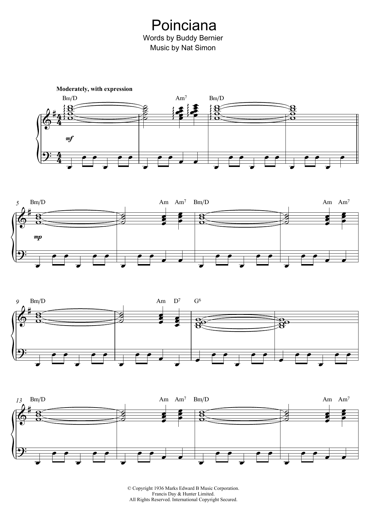 Download or print Nat Simon Poinciana sheet music, chords and digital score arranged for Piano Solo. This Jazz score includes 5 page(s).