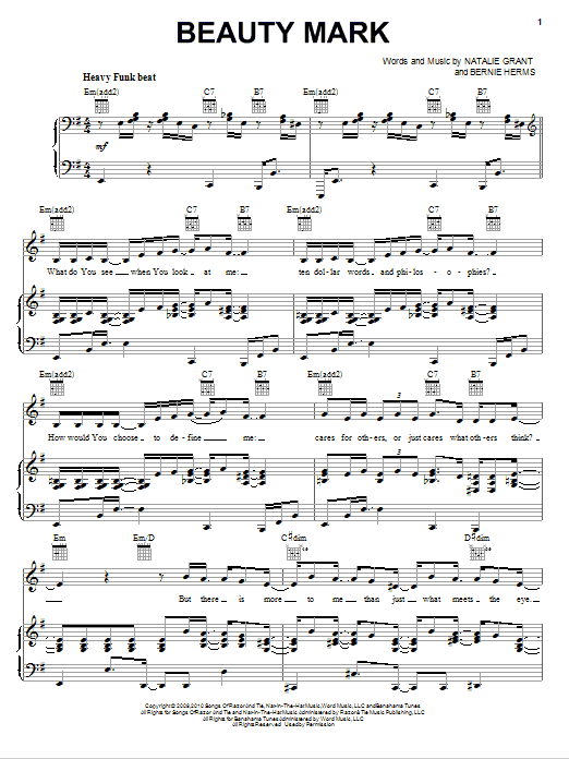Download or print Natalie Grant Beauty Mark sheet music, chords and digital score arranged for Piano, Vocal & Guitar Chords (Right-Hand Melody). This Christian score includes 7 page(s).
