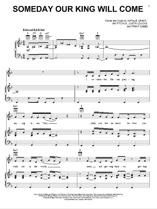 Download or print Natalie Grant Someday Our King Will Come sheet music, chords and digital score arranged for Piano, Vocal & Guitar Chords (Right-Hand Melody). This Christian score includes 7 page(s).