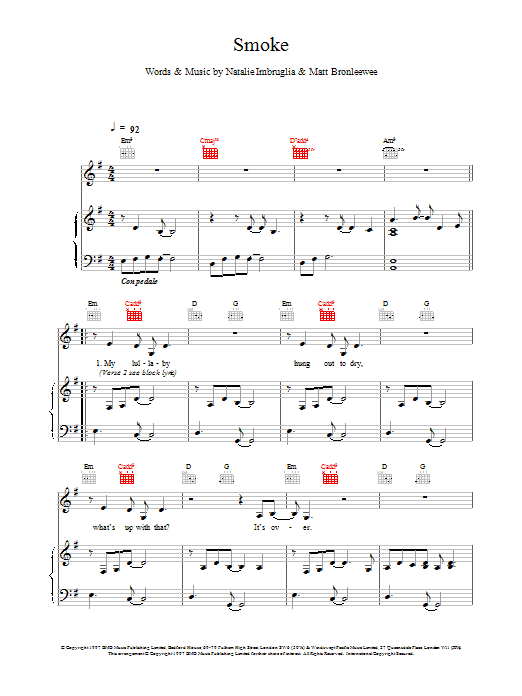 Download or print Natalie Imbruglia Smoke sheet music, chords and digital score arranged for Guitar Chords/Lyrics. This Pop score includes 2 page(s).