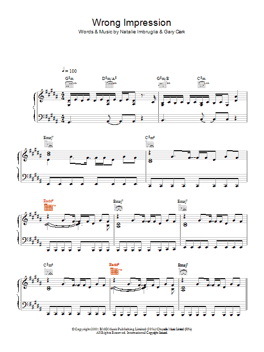 Download or print Natalie Imbruglia Wrong Impression sheet music, chords and digital score arranged for Piano, Vocal & Guitar Chords (Right-Hand Melody). This Pop score includes 7 page(s).