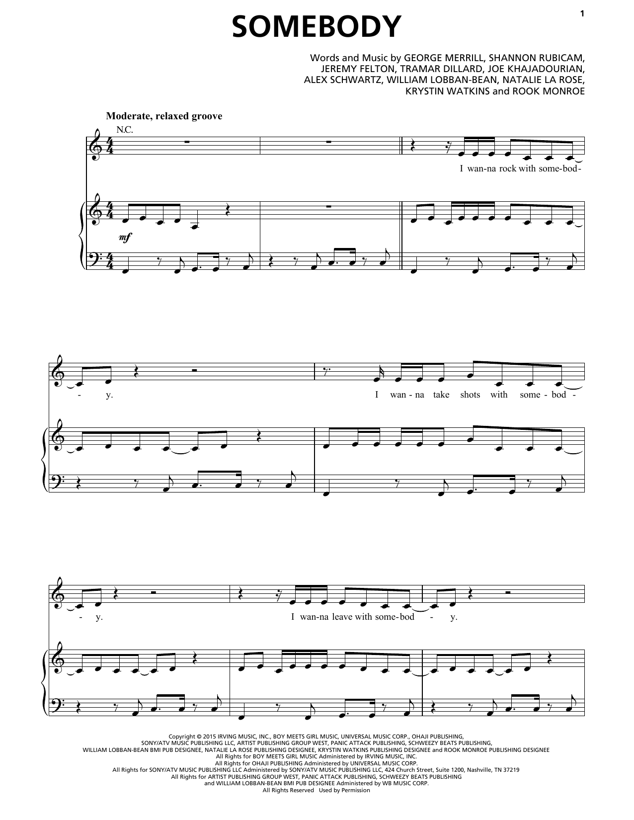 Download or print Natalie La Rose feat. Jeremih Somebody sheet music, chords and digital score arranged for Piano, Vocal & Guitar Chords (Right-Hand Melody). This Pop score includes 5 page(s).