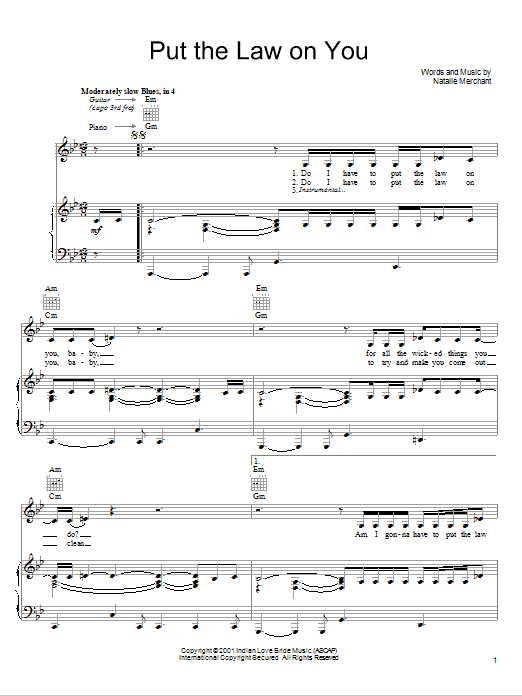 Download or print Natalie Merchant Put The Law On You sheet music, chords and digital score arranged for Piano, Vocal & Guitar Chords (Right-Hand Melody). This Pop score includes 7 page(s).