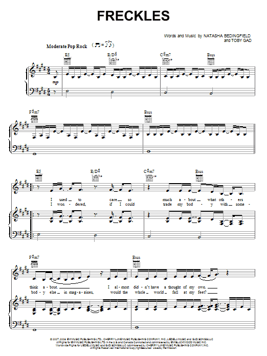 Download or print Natasha Bedingfield Freckles sheet music, chords and digital score arranged for Piano, Vocal & Guitar Chords (Right-Hand Melody). This Pop score includes 7 page(s).