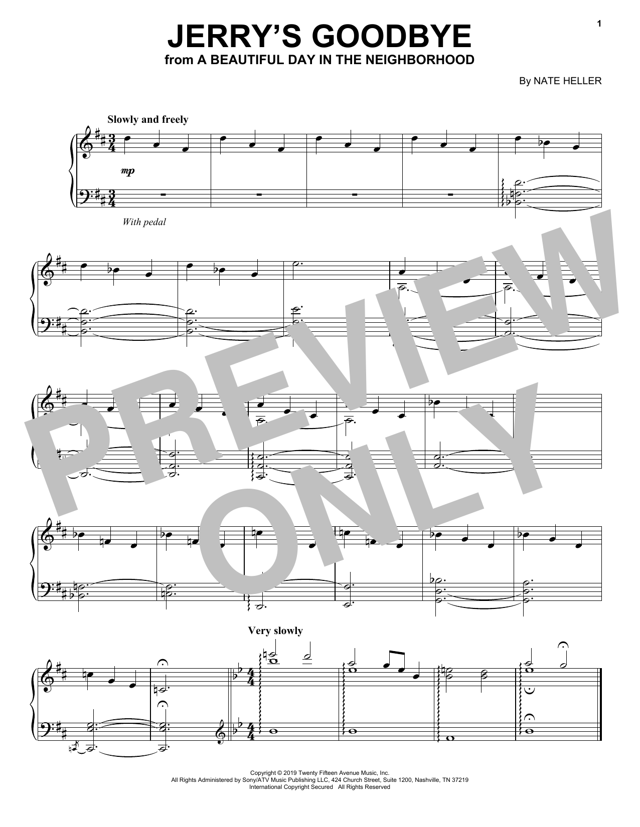 Download or print Nate Heller Jerry's Goodbye (from A Beautiful Day in the Neighborhood) sheet music, chords and digital score arranged for Piano Solo. This Children score includes 1 page(s).
