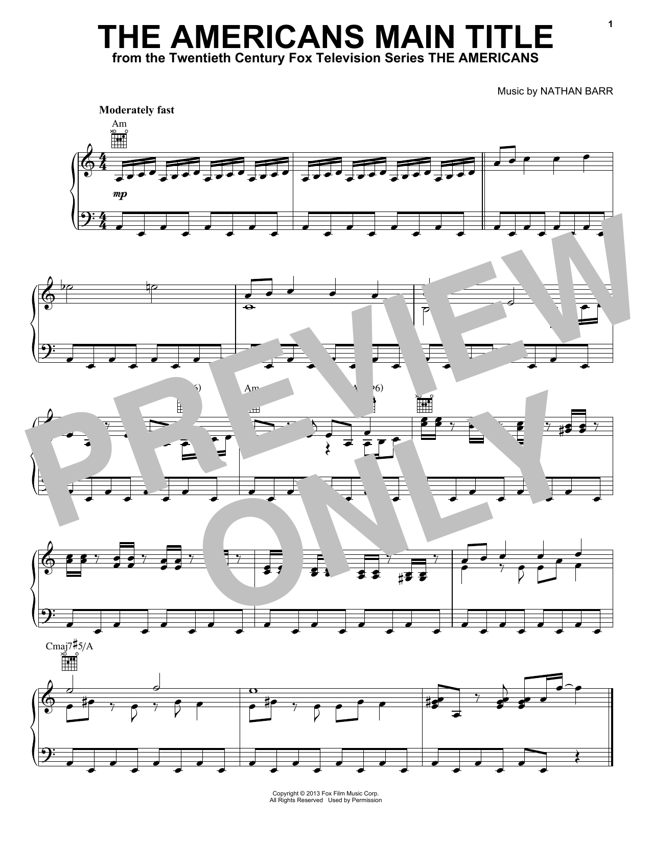 Download or print Nathan Barr The Americans Main Title sheet music, chords and digital score arranged for Piano Solo. This Film/TV score includes 1 page(s).