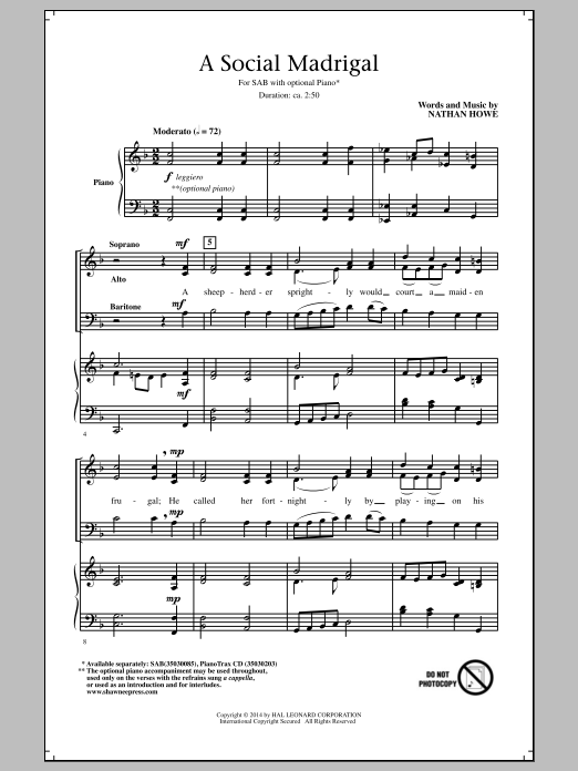 Download or print Nathan Howe A Social Madrigal sheet music, chords and digital score arranged for SAB Choir. This Concert score includes 8 page(s).