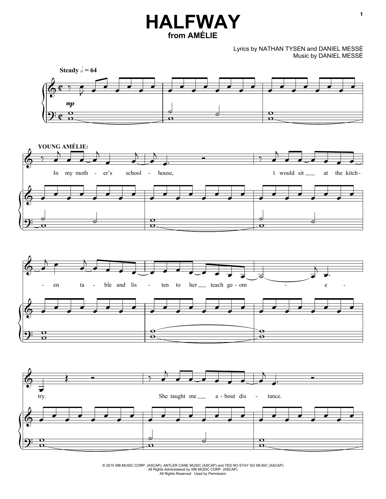 Download or print Nathan Tysen & Daniel Messé Halfway (from Amélie The Musical) sheet music, chords and digital score arranged for Piano & Vocal. This Musical/Show score includes 7 page(s).
