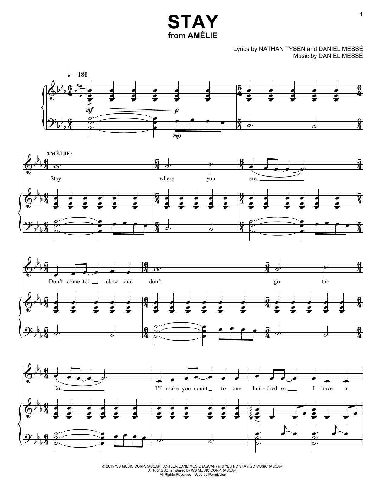 Download or print Nathan Tysen & Daniel Messé Stay (from Amélie The Musical) sheet music, chords and digital score arranged for Piano & Vocal. This Musical/Show score includes 8 page(s).